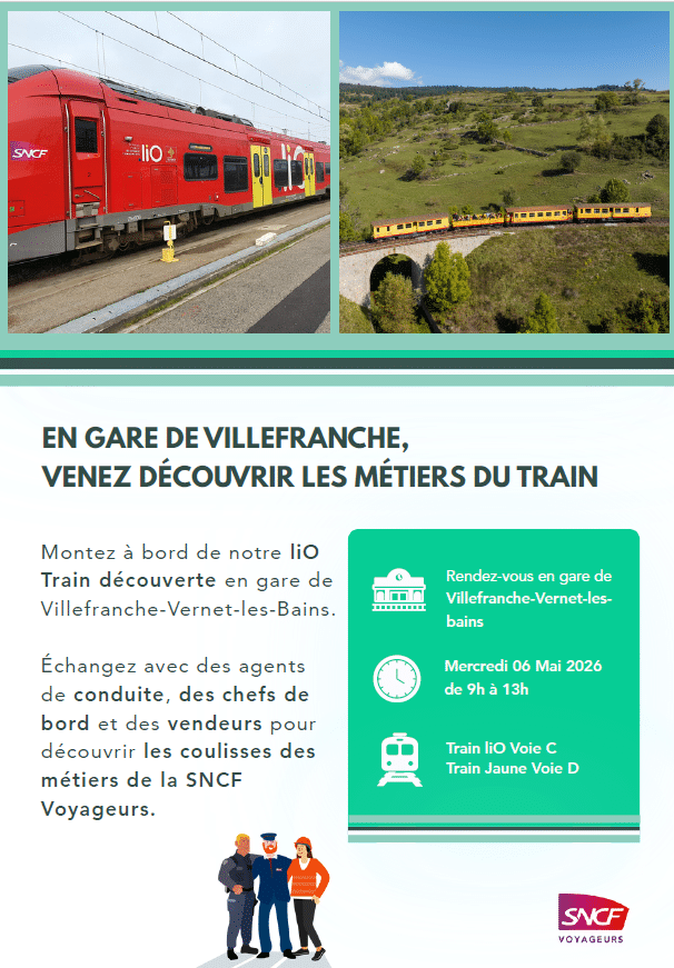 Venez découvrir les métiers du ferroviaire lors d’une demi-journée à l’initiative de SNCF Voyageur et de la Région Occitanie / Pyrénées-Méditerranée, dans le cadre des actions de promotion de la mobilité et de valorisation de notre territoire.