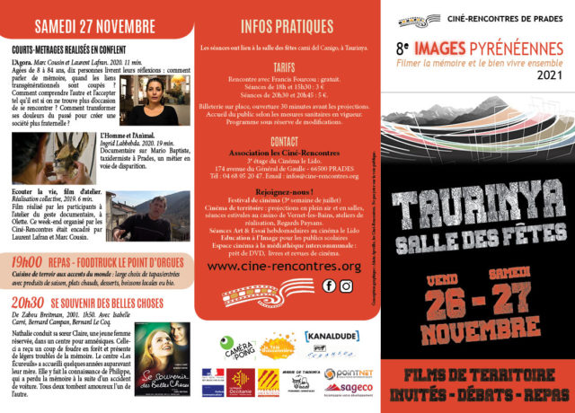 Les Ciné-rencontres organisent chaque année Images Pyrénéennes, des rencontres audiovisuelles en lien avec le massif. Cette année il aura lieu vendredi 26 et samedi 27 novembre à Taurinya. https://www.cine-rencontres.org/images-pyreneennes/