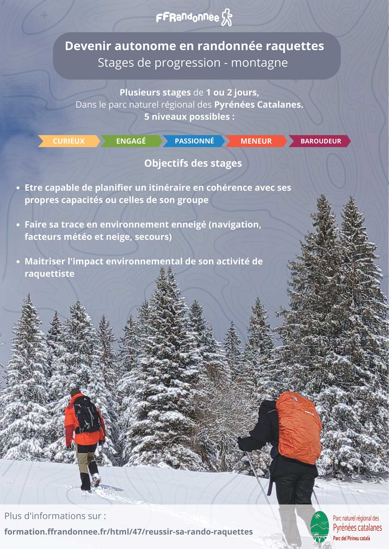 Cet hiver, le Parc naturel régional des Pyrénées catalanes accueille la Fédération Française de la Randonnée Pédestre qui organise des stages de progression hivernaux dans nos vallées. Ces stages de formation s’adressent à tous ceux qui veulent approfondir leur approche de la montagne et de la pratique de la randonnée en espaces naturels.